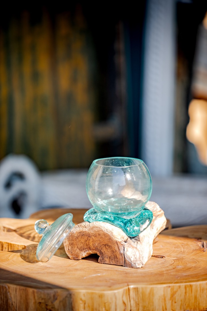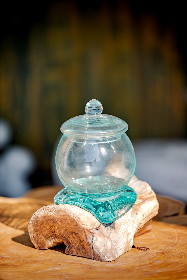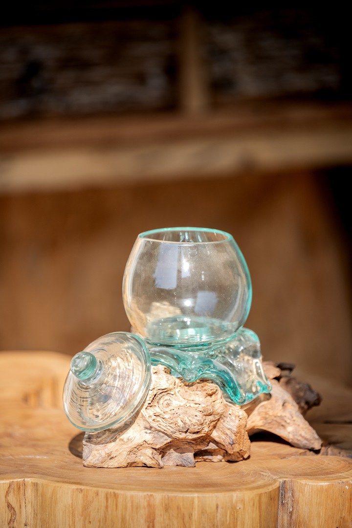 Le verre soufflé sur une racine de teck en forme de bonbonnière est un objet artisanal unique qui nous vient tout droit de Bali. Cet objet est le fruit d’un travail minutieux et passionné de la part d’artisans locaux qui ont mis tout leur savoir-faire pour créer une pièce exceptionnelle.
