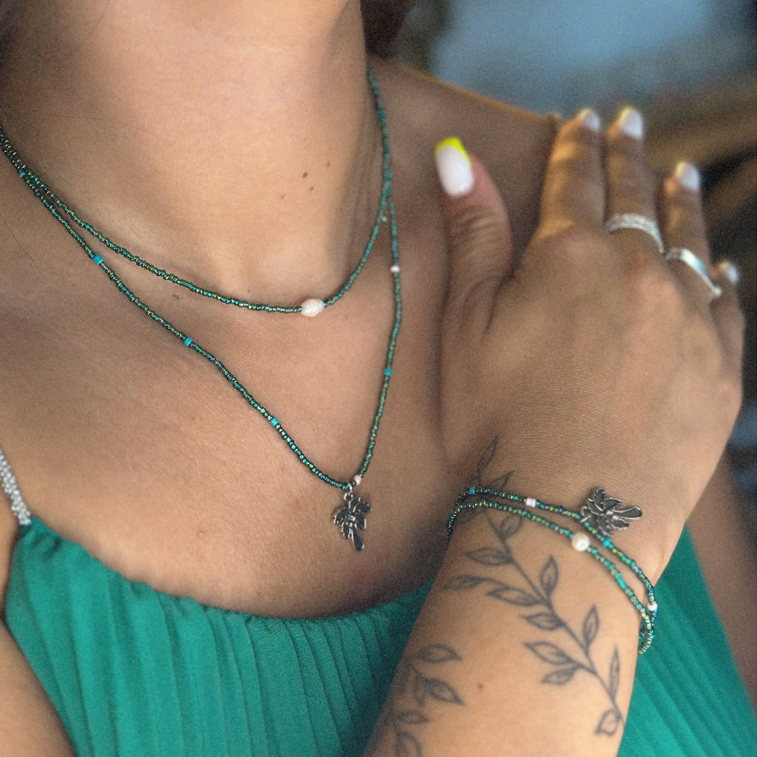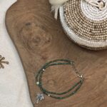 Découvrez notre bracelet double rang vert fait à la main à Bali avec des perles vertes aux reflets bleutés. Ce bijou unique se distingue par ses deux rangs distincts : l’un orné d’un pendentif argenté en forme de palmier, l’autre décoré d’une perle blanche délicate. Ce bracelet apporte une touche d’élégance exotique à votre style et est également disponible en version collier pour un ensemble harmonieux et coordonné. Parfait pour ajouter une note de raffinement à votre tenue, ce bracelet témoigne du savoir-faire exceptionnel des artisans balinais.