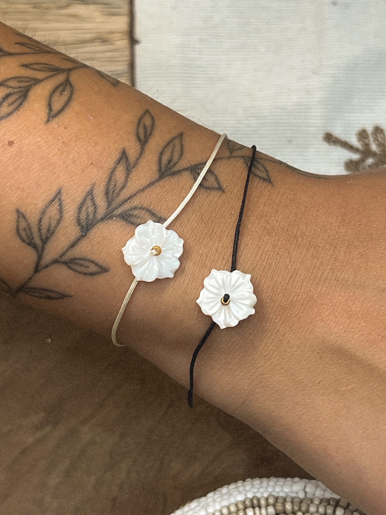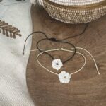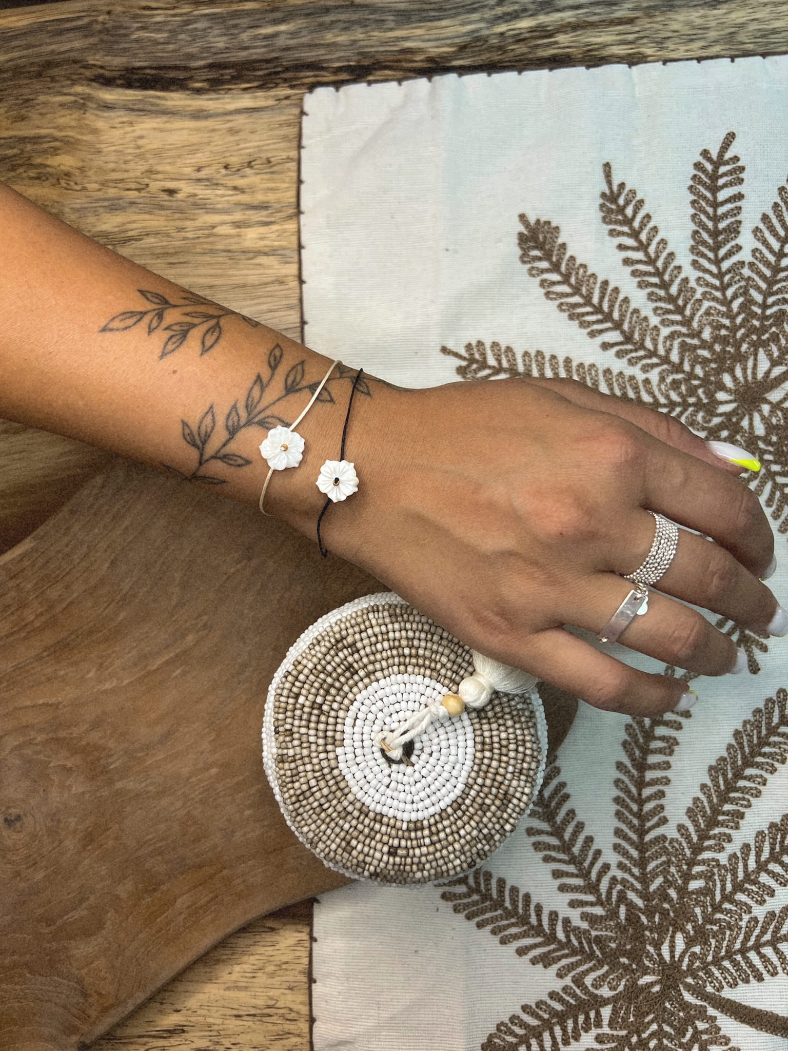 Apportez une touche d’élégance avec notre bracelet en cordon ajustable, fait main à Bali. Orné d’une fleur blanche en nacre, ce bijou délicat est disponible avec un cordon blanc ou noir, parfait pour toutes les occasions.