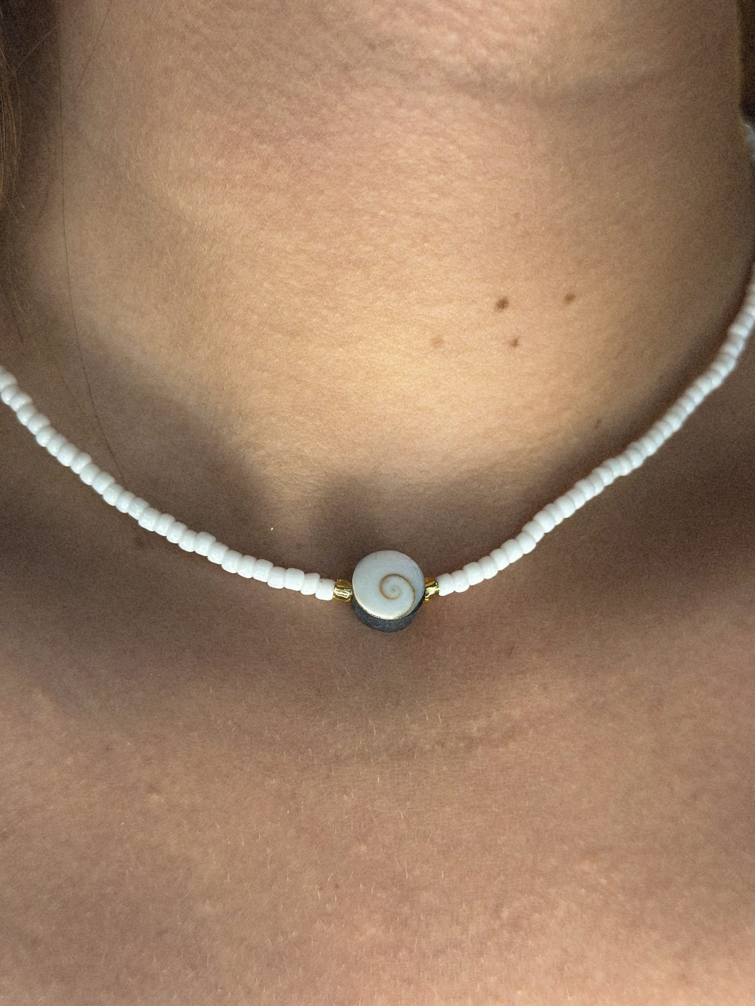 Apportez une touche de Bali à votre look avec notre collier en perles blanches et coquillage œil de sainte Lucie. Un bijou fait main qui combine tradition et élégance.
