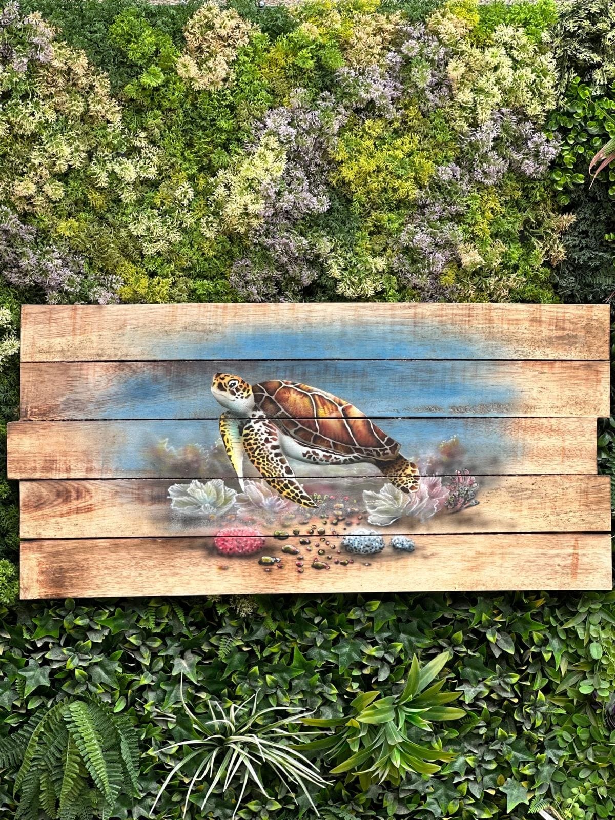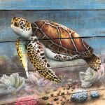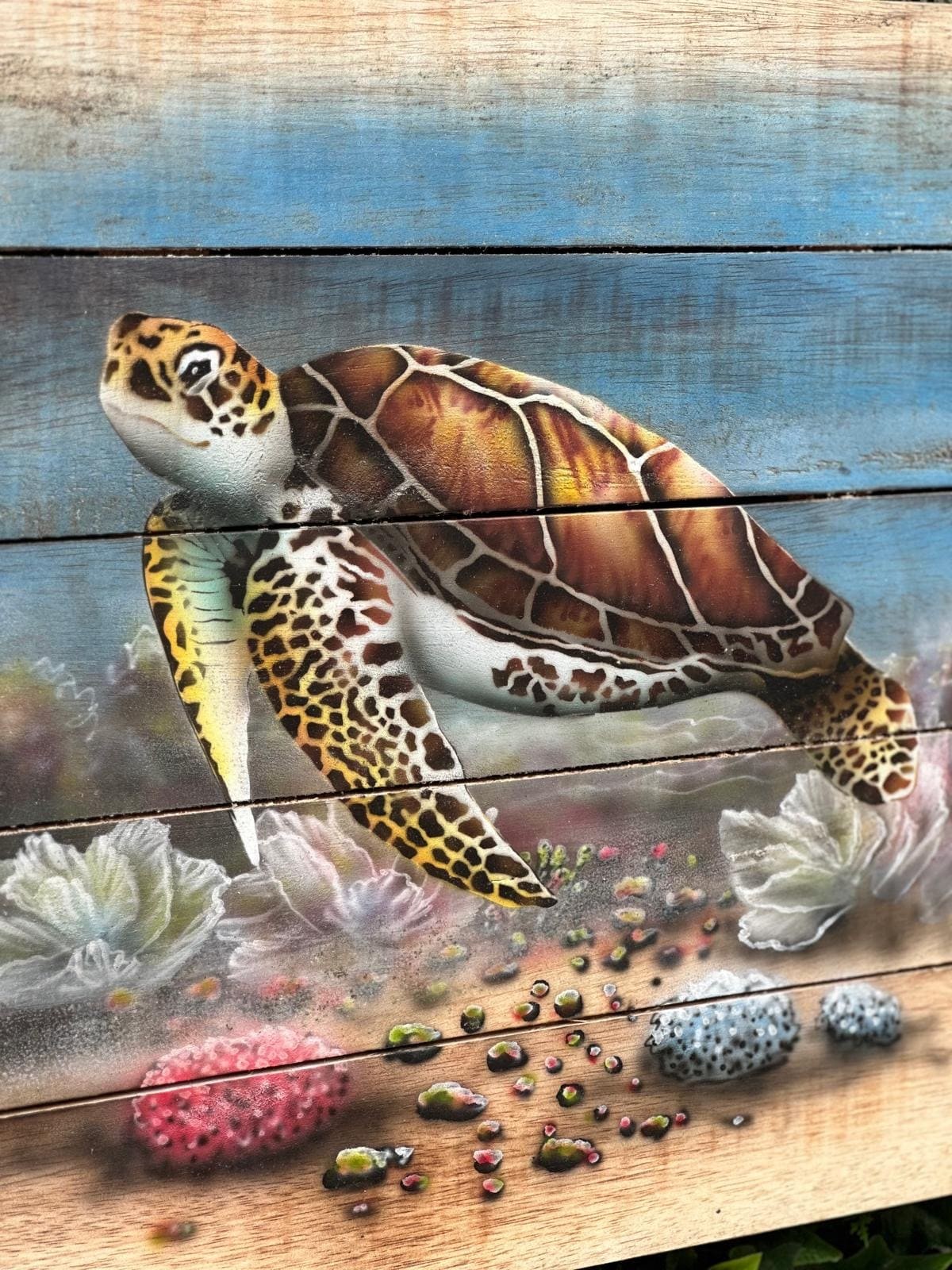 Transformez votre intérieur avec notre tableau en bois unique, directement importé de Bali. Ce chef-d’œuvre, peint à la main, présente une tortue marron entourée de coraux colorés sur un fond bleu partiel, mettant en valeur la texture naturelle du bois. Apportez une touche exotique et authentique à votre décoration murale avec cette pièce exceptionnelle, parfaite pour ajouter charme et sérénité à n’importe quel espace.