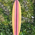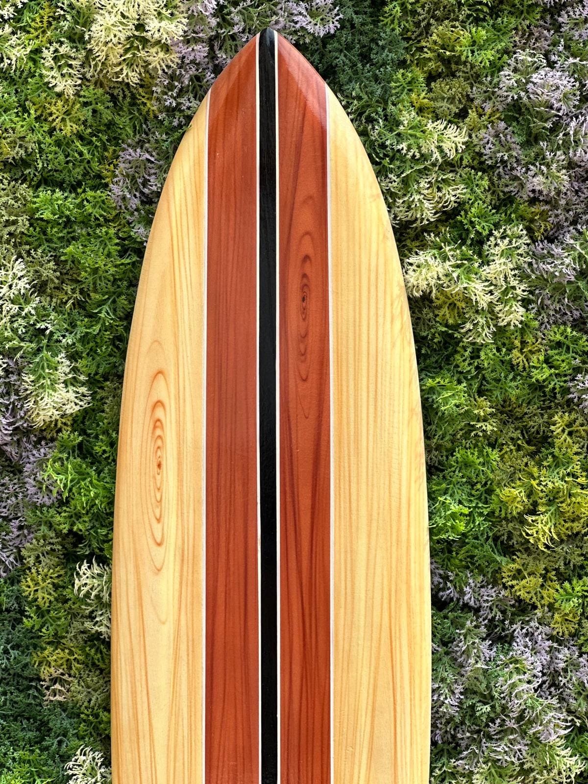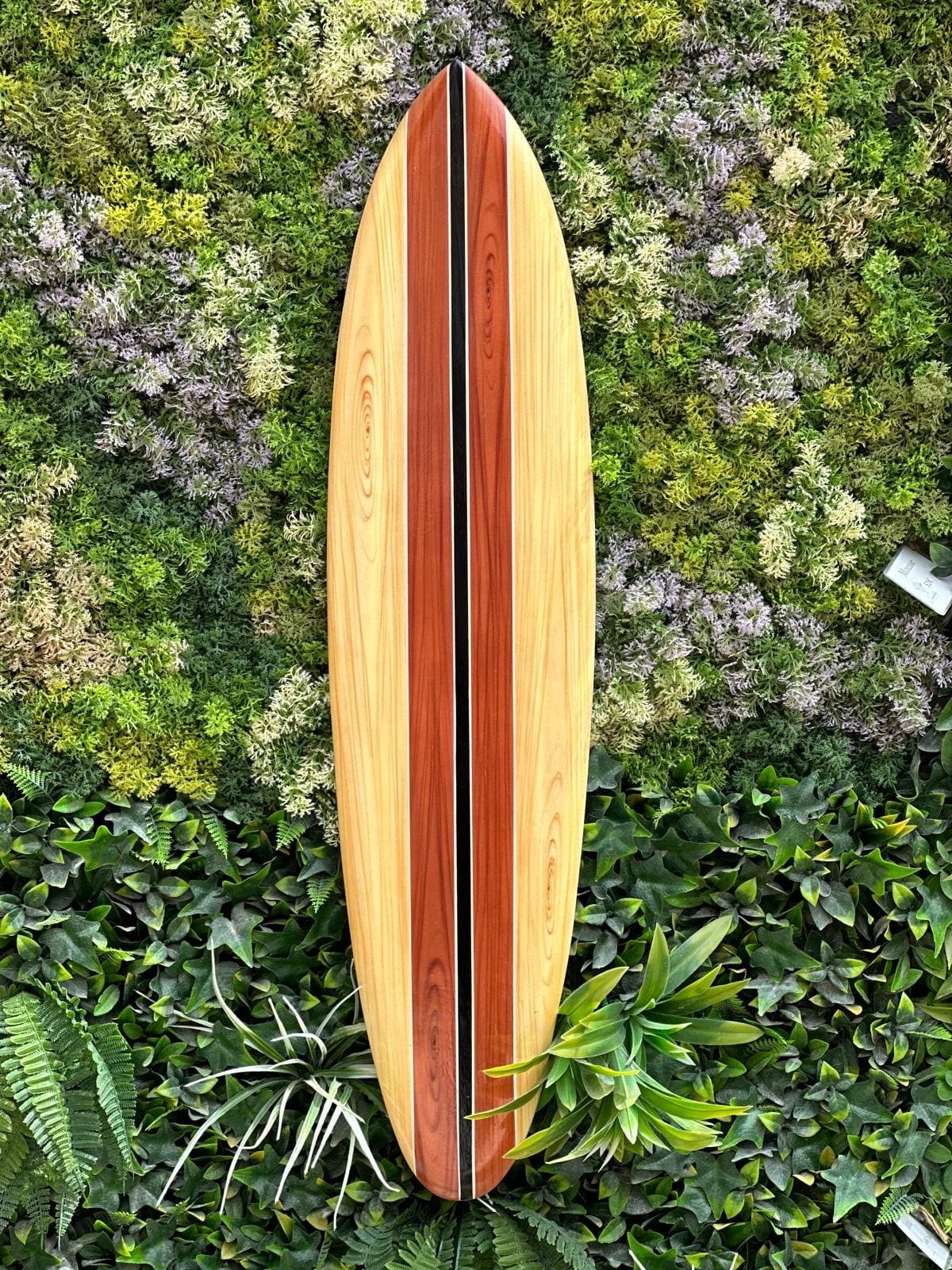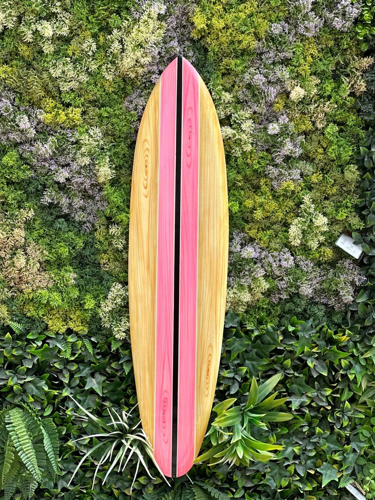 Embellissez votre intérieur avec cette planche de surf en bois, une décoration murale artisanale de Bali. Disponible en rose ou marron, avec un trait noir vertical au centre, cette pièce unique apporte une touche exotique et colorée à votre espace.