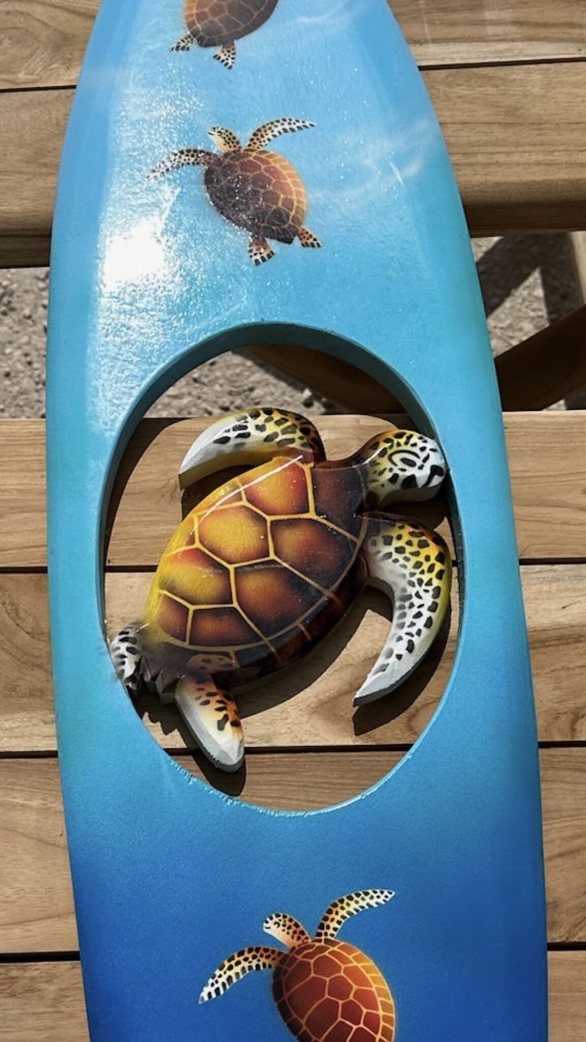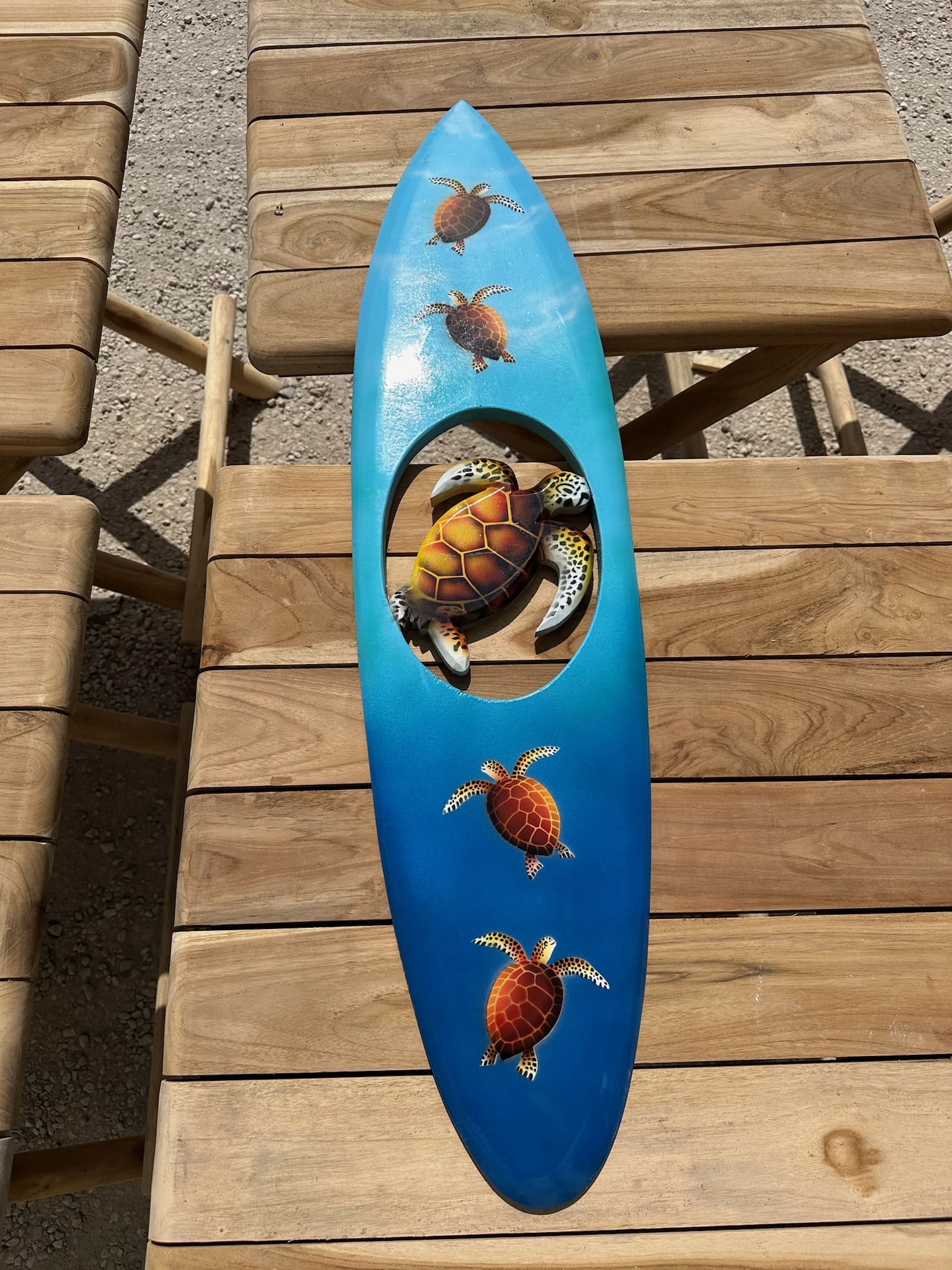 Apportez une véritable touche d’évasion à votre intérieur avec cette décoration murale artisanale de Bali. Notre planche de surf en bois, dans de magnifiques tons bleus, est mise en valeur par de délicates tortues peintes et une majestueuse tortue sculptée en son centre. Chaque planche est façonnée à la main par des artisans balinais, faisant de chaque pièce une création unique. Cette décoration murale en bois incarne l’esprit de Bali, la mer et la liberté. Elle trouvera sa place dans un salon, une chambre ou tout espace souhaitant une atmosphère chaleureuse et dépaysante. Craquez pour l’élégance naturelle de cette planche de surf et laissez Bali s’inviter dans votre décoration.
