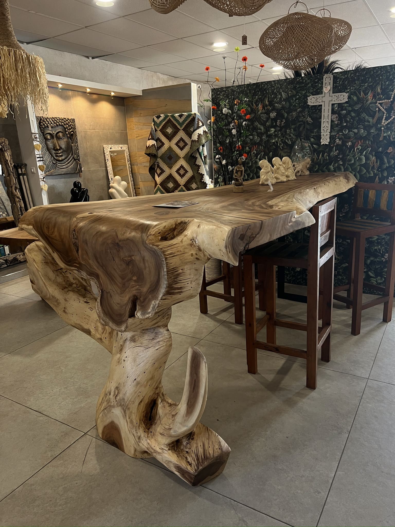 Découvrez nos tables en suar, bois exceptionnel venu de Bali, alliant élégance et robustesse. Chaque pièce est unique, idéale pour sublimer votre décoration intérieure ou extérieure. Disponibles en différentes tailles et hauteurs, ces tables peuvent être utilisées comme mobilier de repas ou mange-debout. Un choix parfait pour ceux qui recherchent une décoration authentique et raffinée.