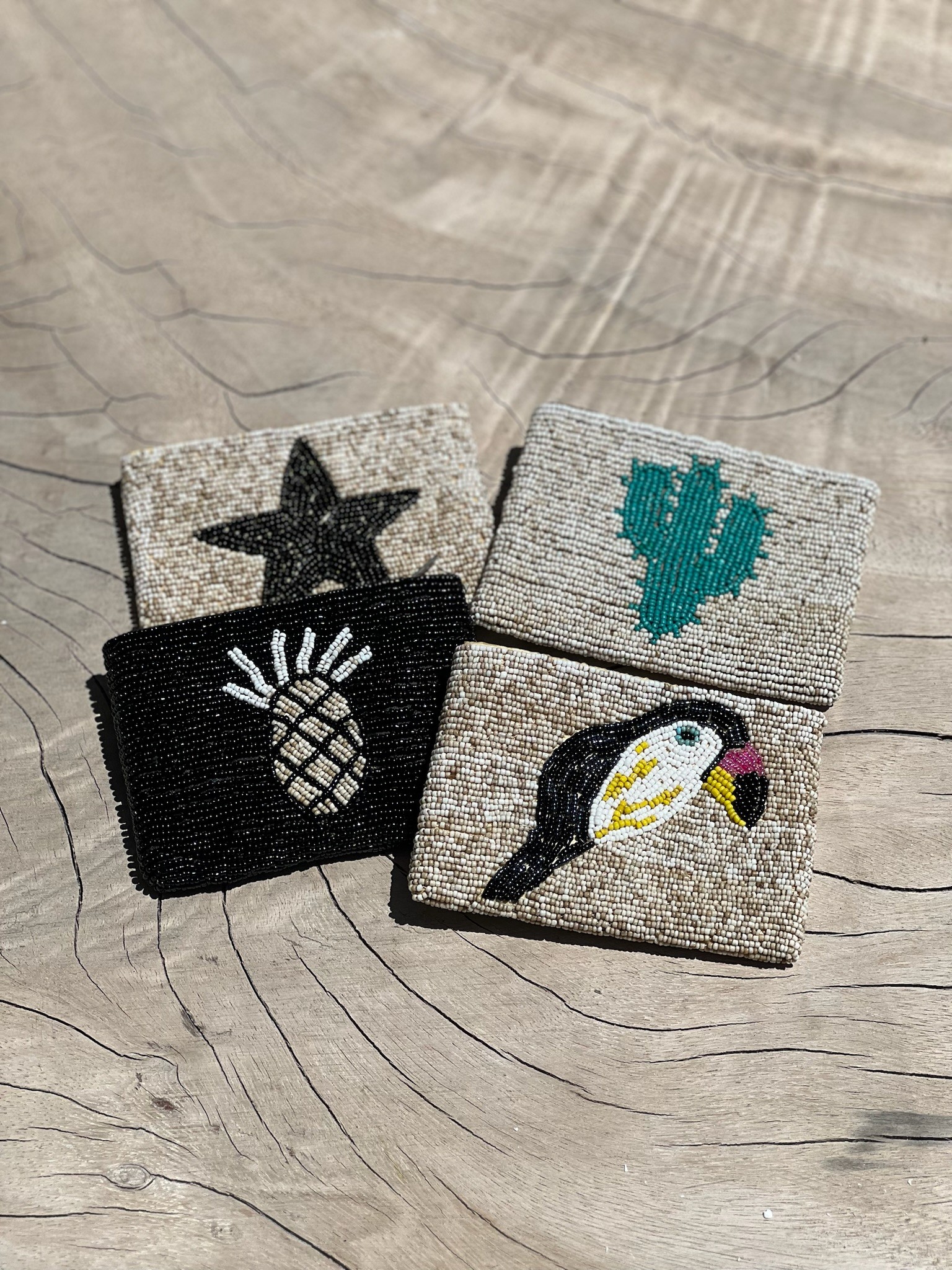 Découvrez nos pochettes en perles artisanales de Bali, disponibles en quatre modèles : ananas, étoile, toucan et cactus. Ces pochettes peuvent aussi servir de porte-monnaie, ajoutant une touche exotique et élégante à votre style.