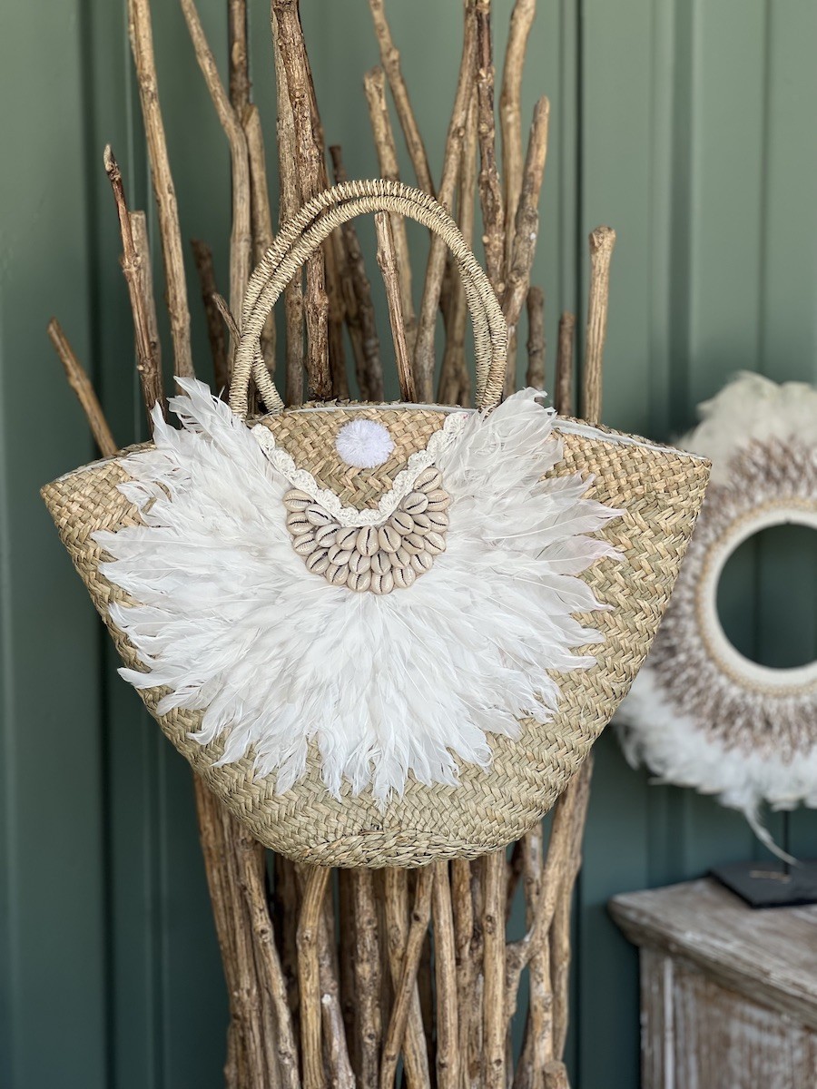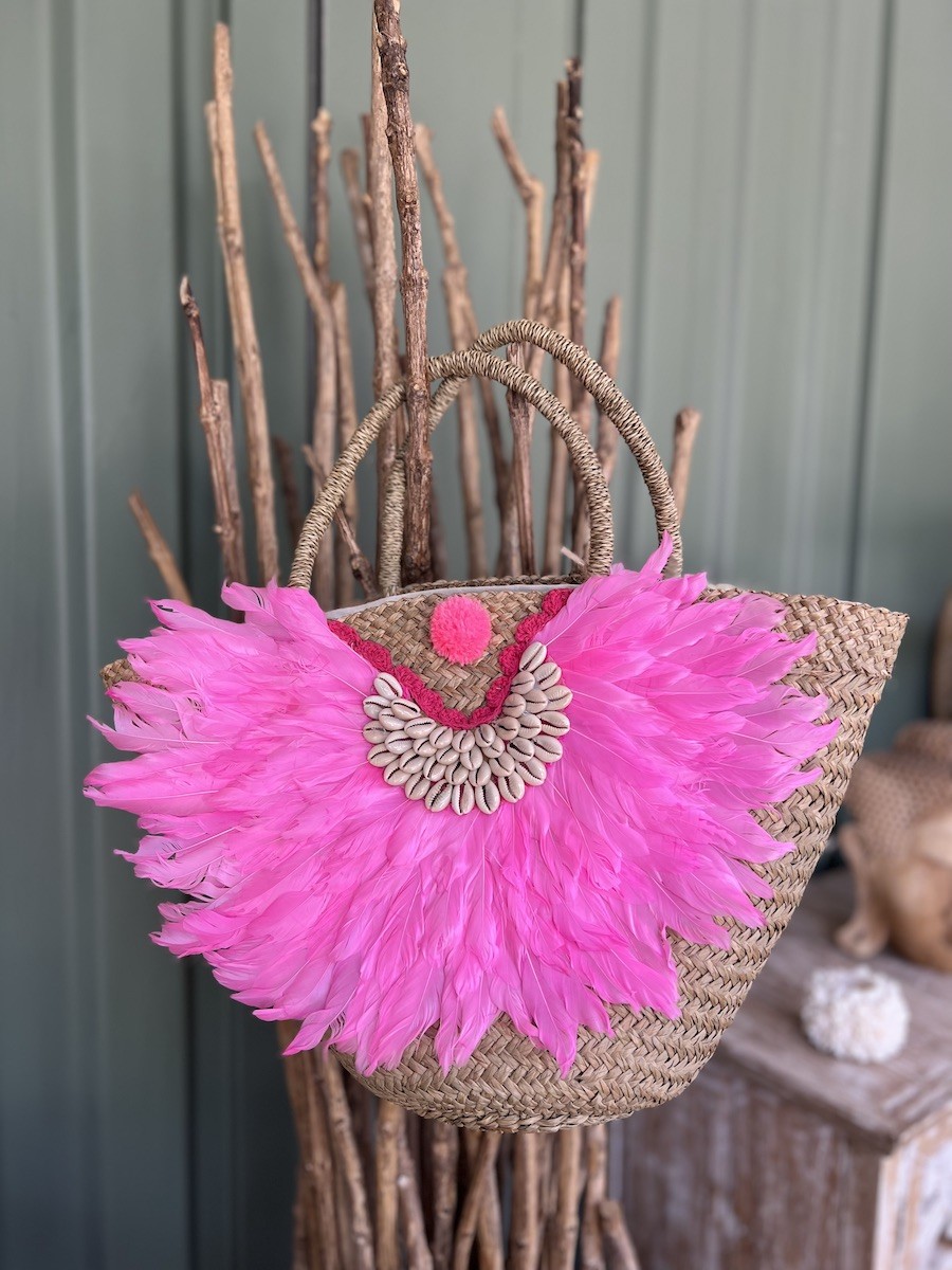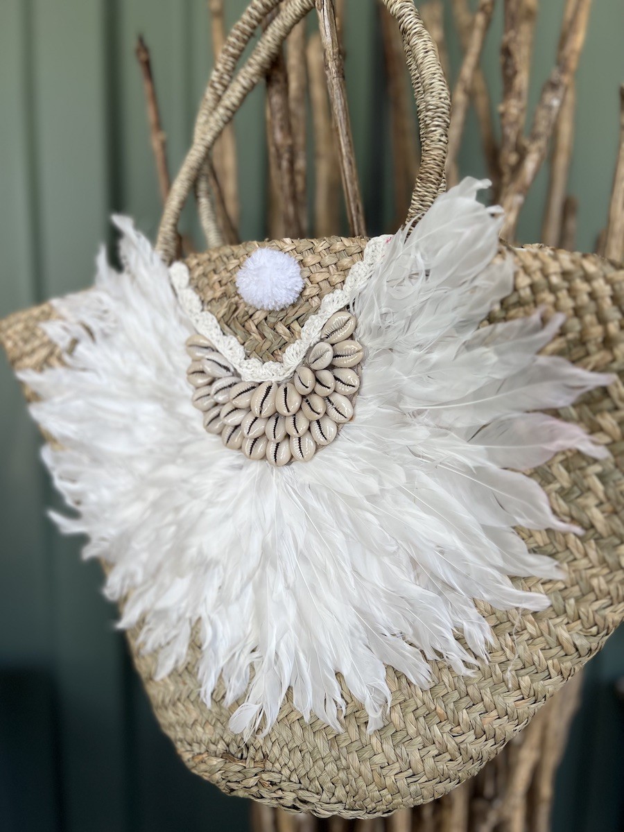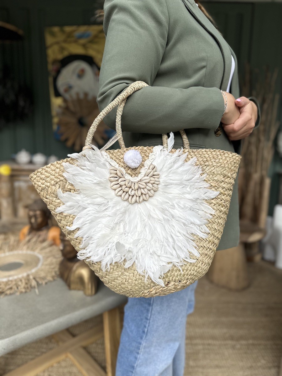 Le sac en osier et en plumes est un accessoire de mode idéal pour les sorties d’été et les journées à la plage. Fabriqué à la main par des artisans balinais, ce sac est disponible en blanc et rose, et dispose d’une doublure à l’intérieur pour plus de solidité. Ce sac au style bohème chic, élégant et raffiné est parfait pour toutes les occasions, que ce soit pour une sortie entre amies, une journée à la plage ou une soirée en ville.