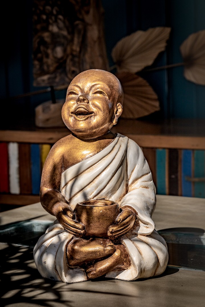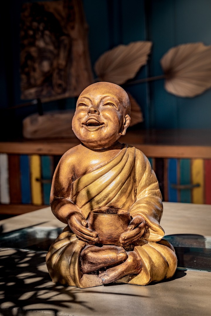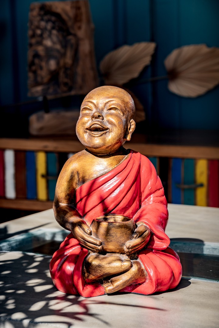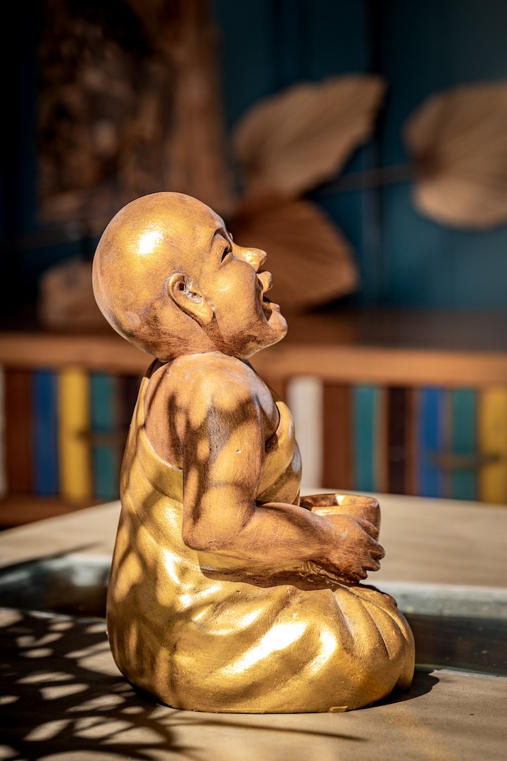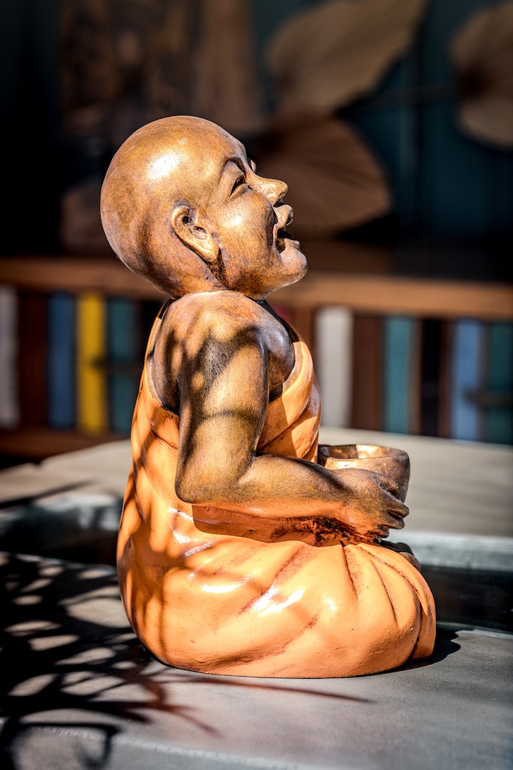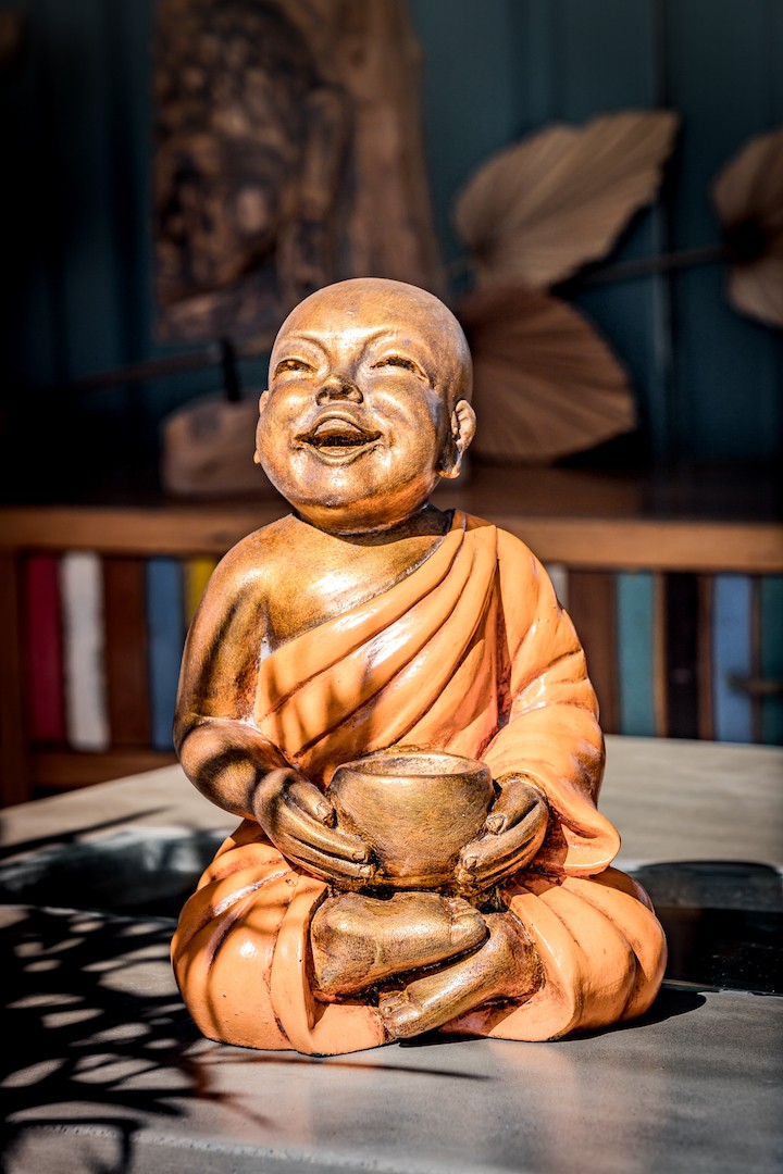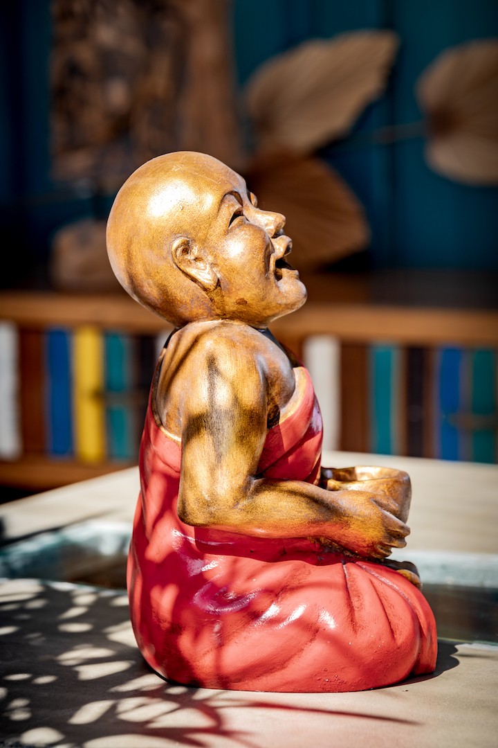 Shaolin rieur assis avec un bol