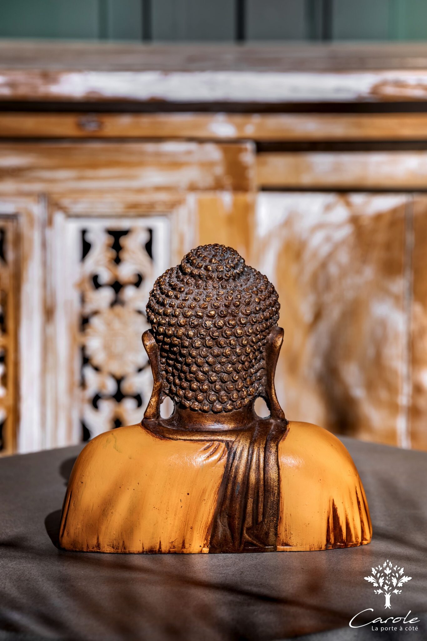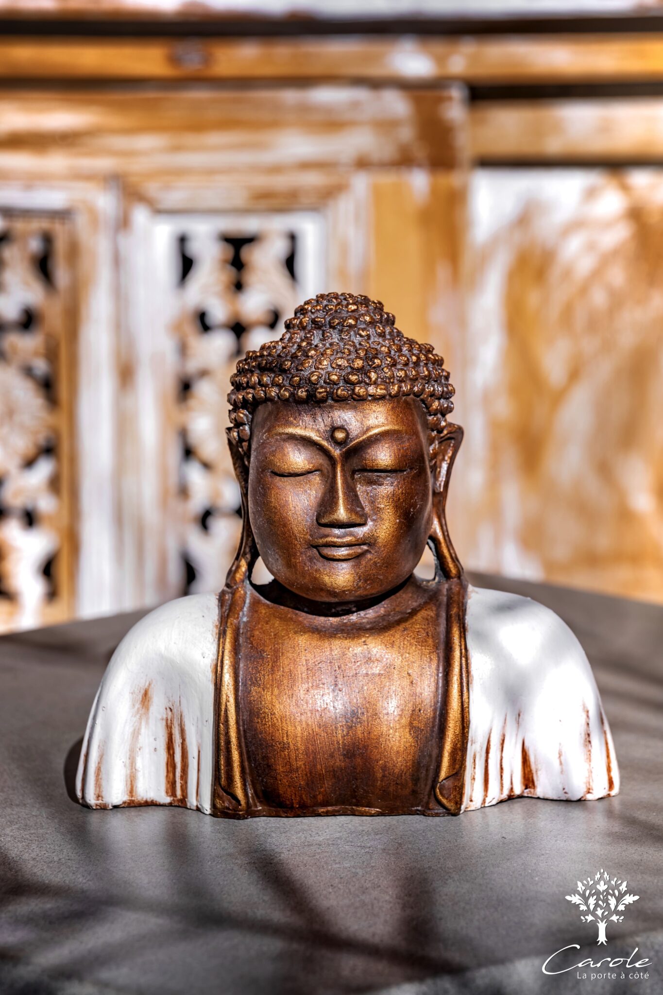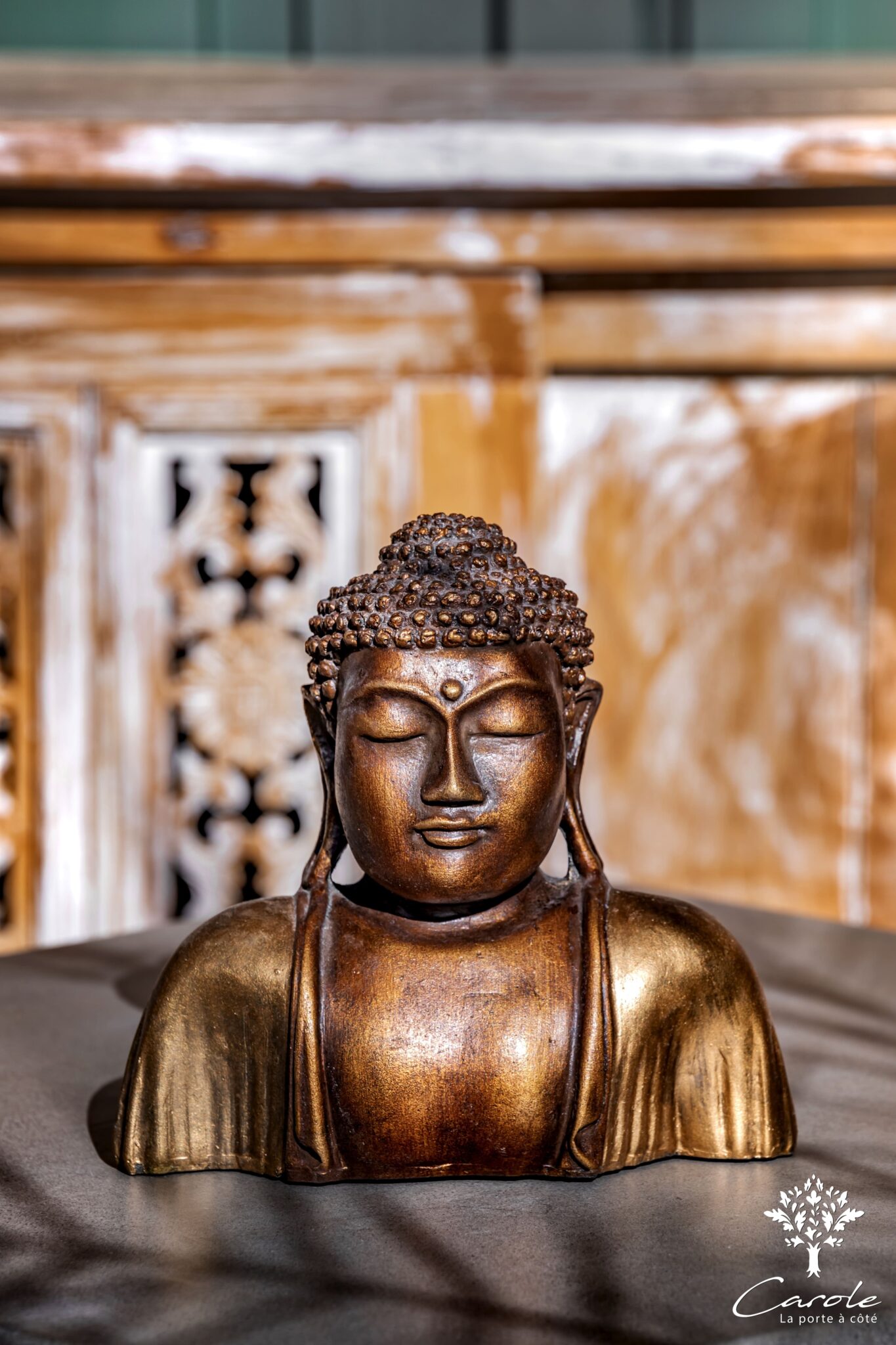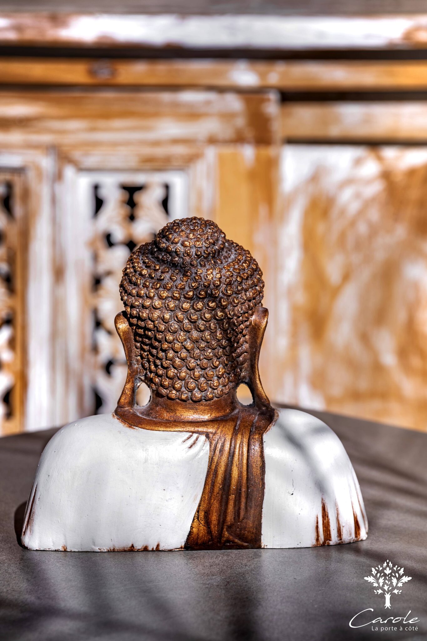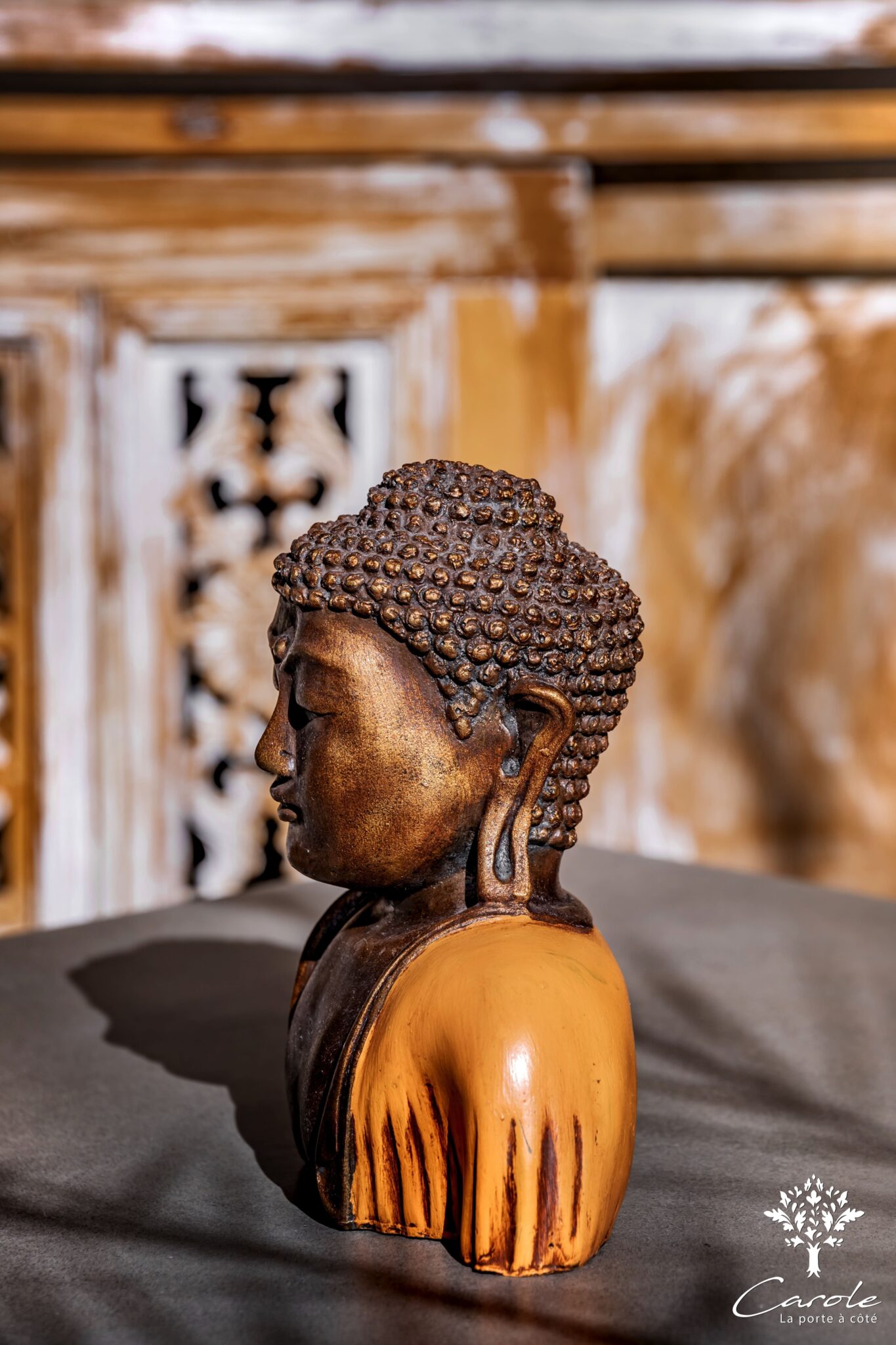 Cette statuette en buste de Bouddha est une œuvre d’art artisanale indonésienne qui incarne la beauté et la sérénité de la culture bouddhiste. Sculptée avec soin dans une pierre de qualité supérieure, chaque détail de cette pièce est travaillé avec minutie, de la couronne délicate qui repose sur la tête du Bouddha, à la robe drapée en tissu qui descend sur les épaules.