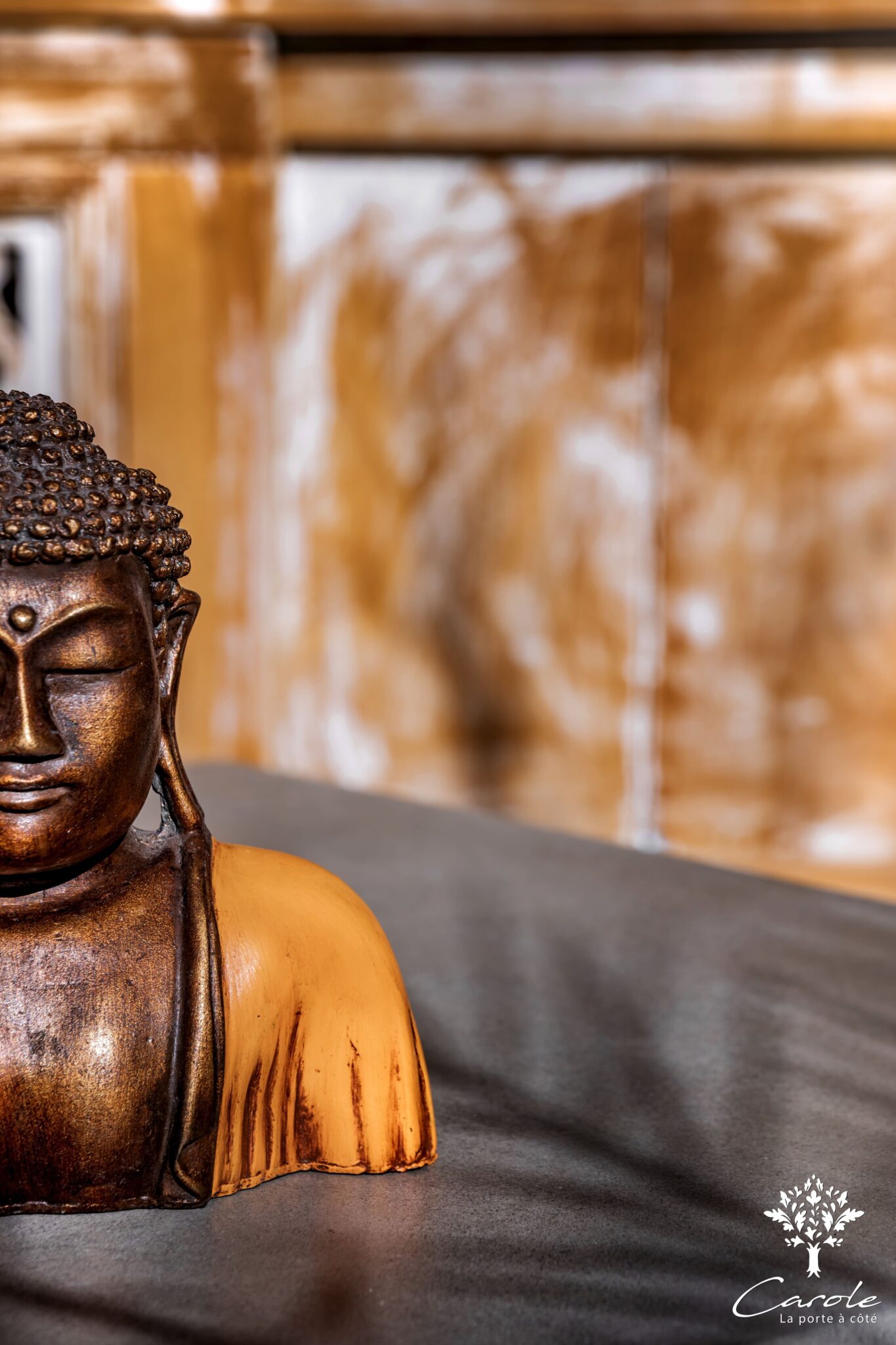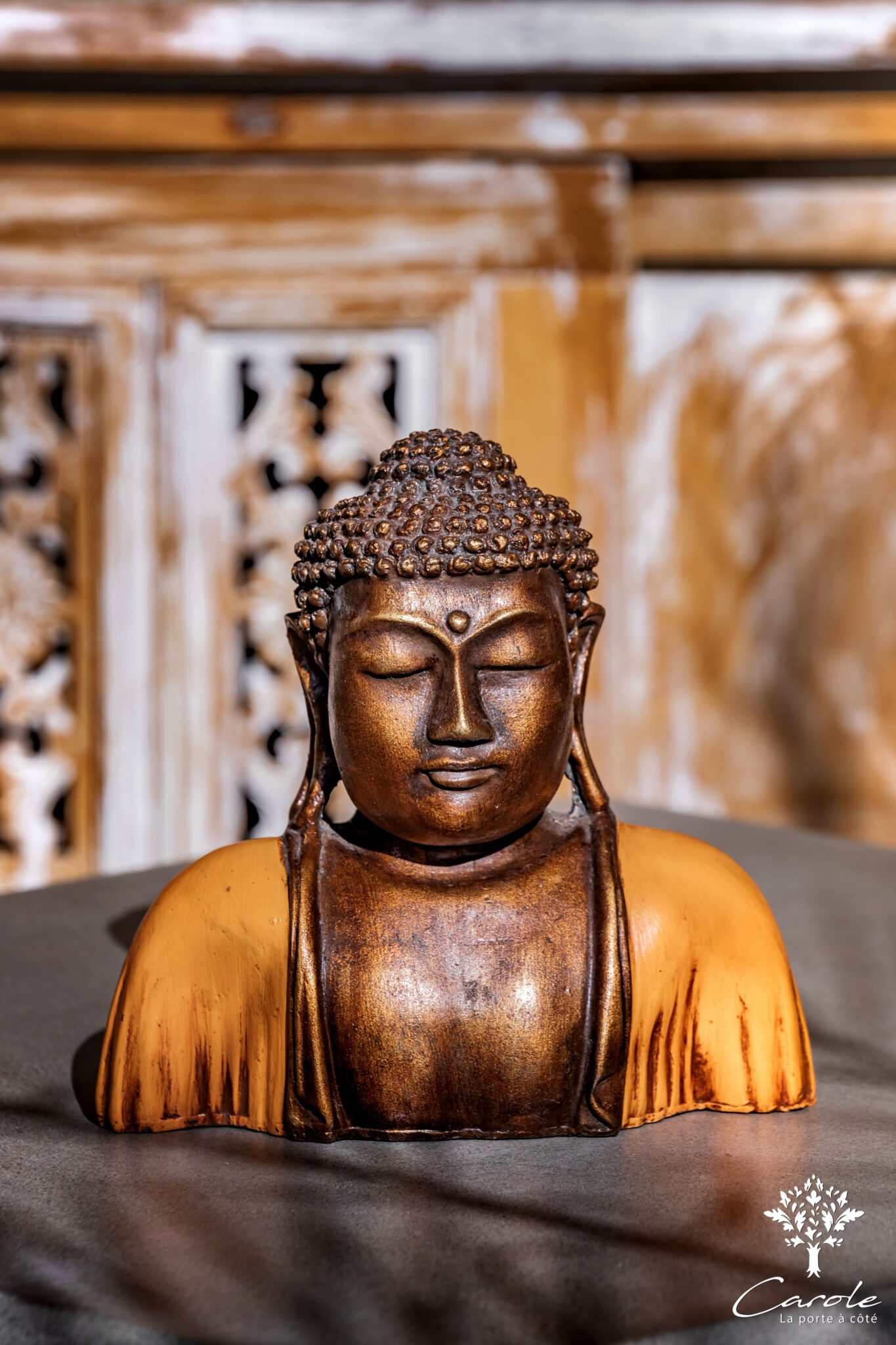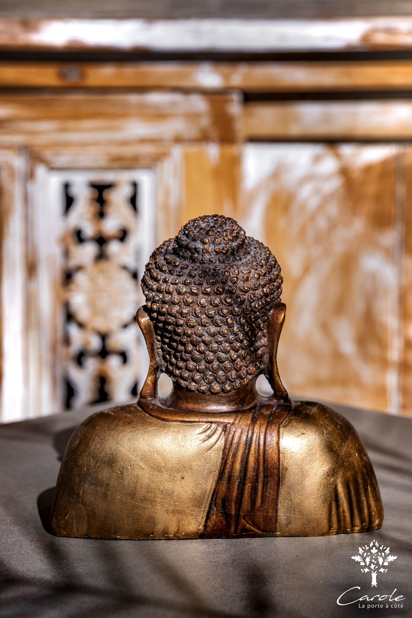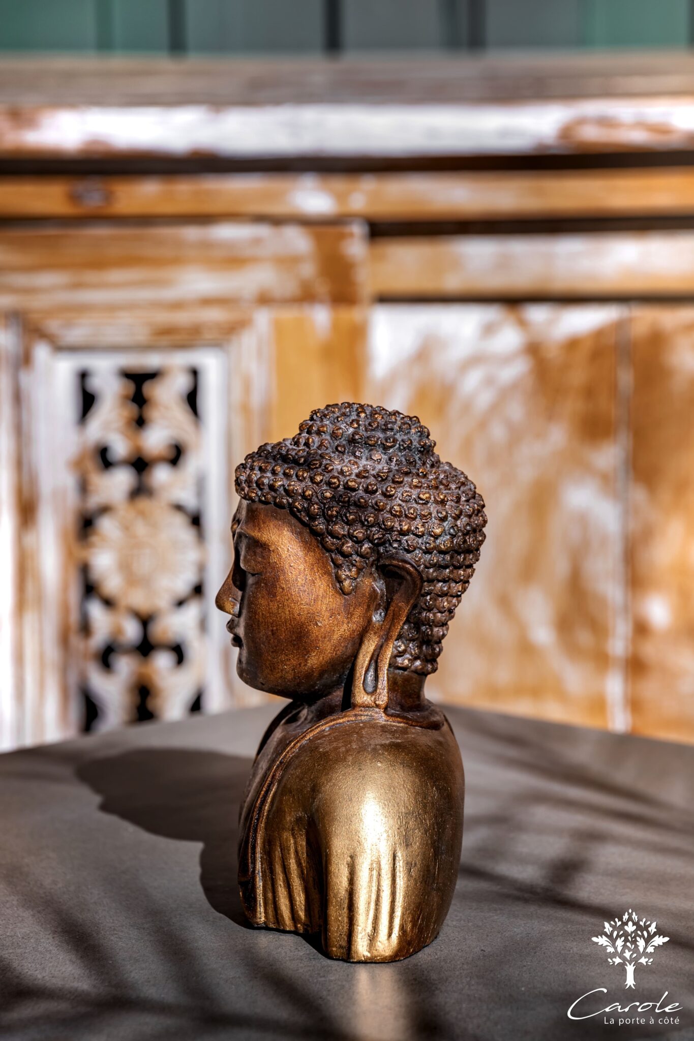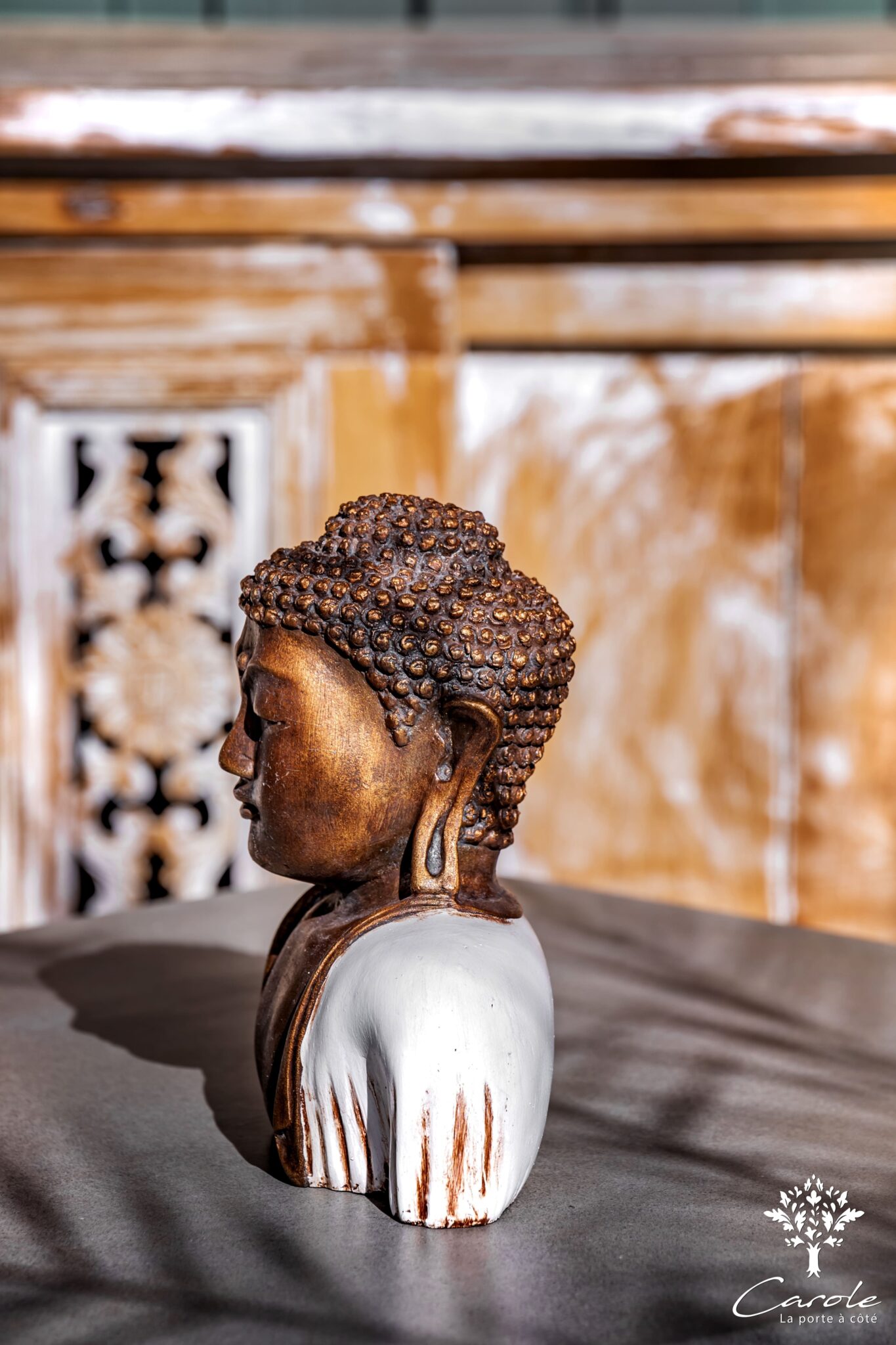 Cette statuette en buste de Bouddha est une œuvre d’art artisanale indonésienne qui incarne la beauté et la sérénité de la culture bouddhiste. Sculptée avec soin dans une pierre de qualité supérieure, chaque détail de cette pièce est travaillé avec minutie, de la couronne délicate qui repose sur la tête du Bouddha, à la robe drapée en tissu qui descend sur les épaules.