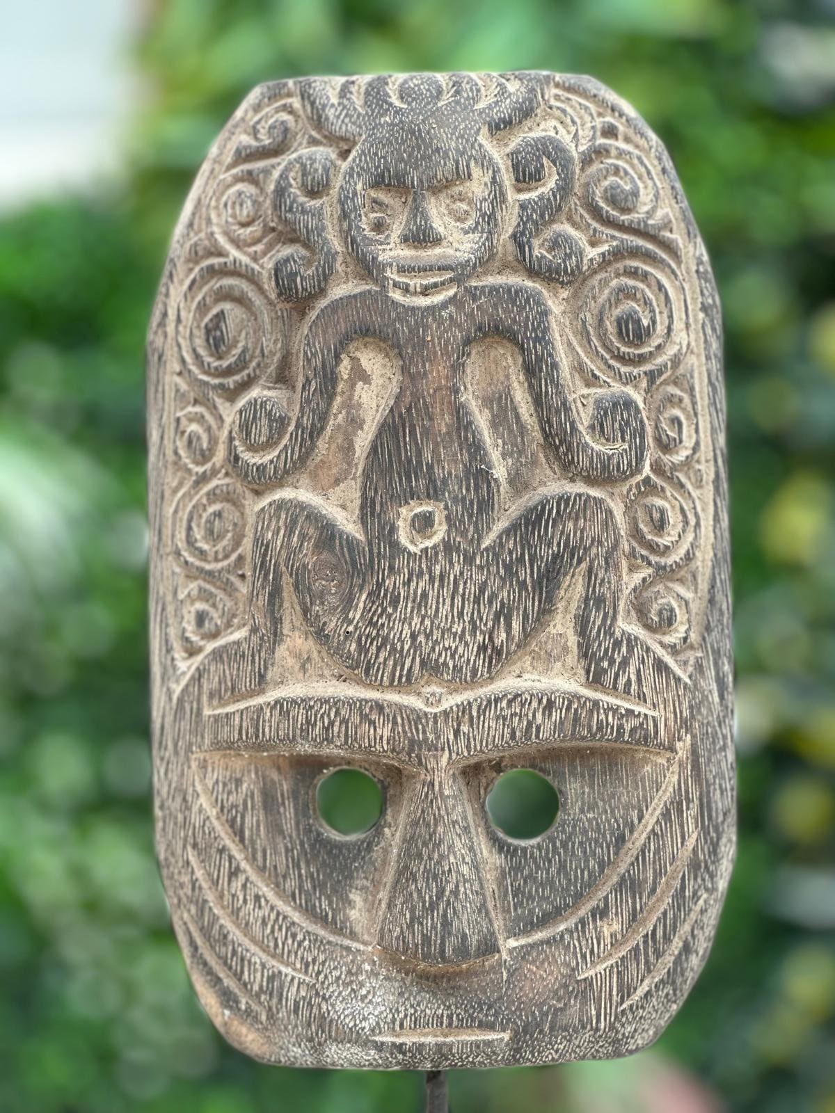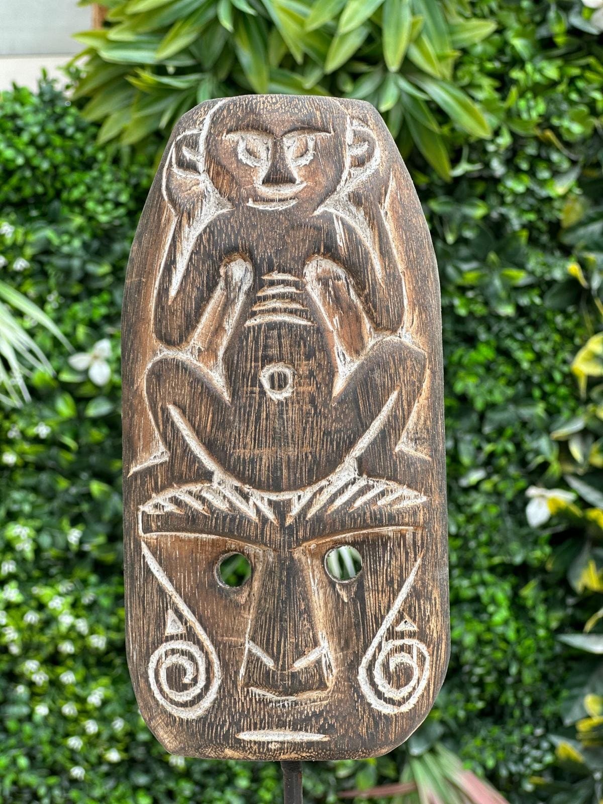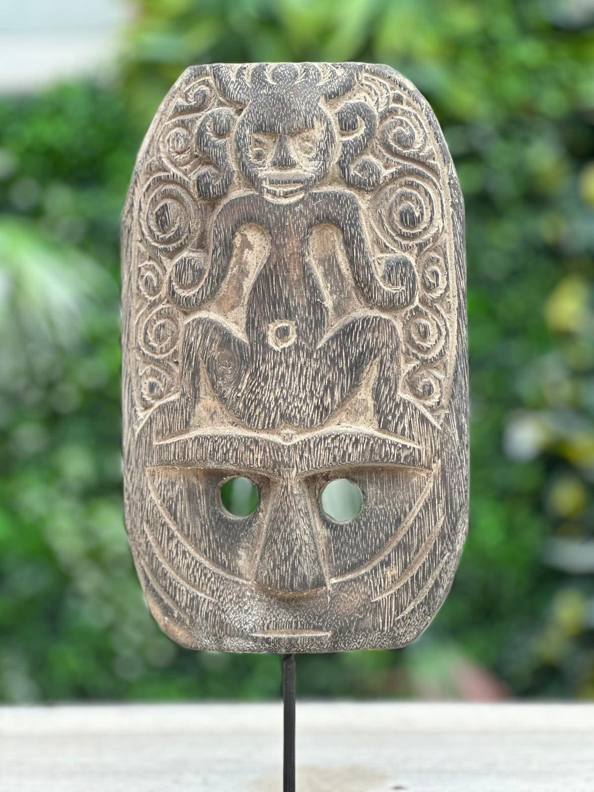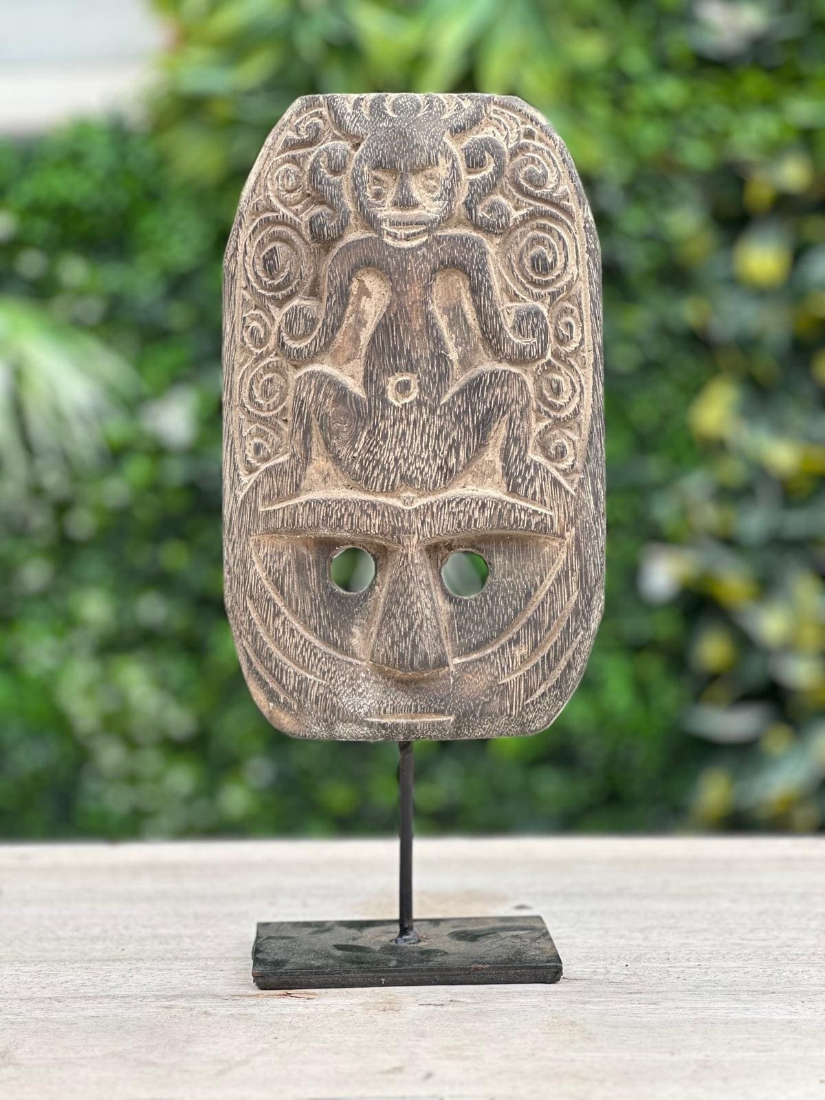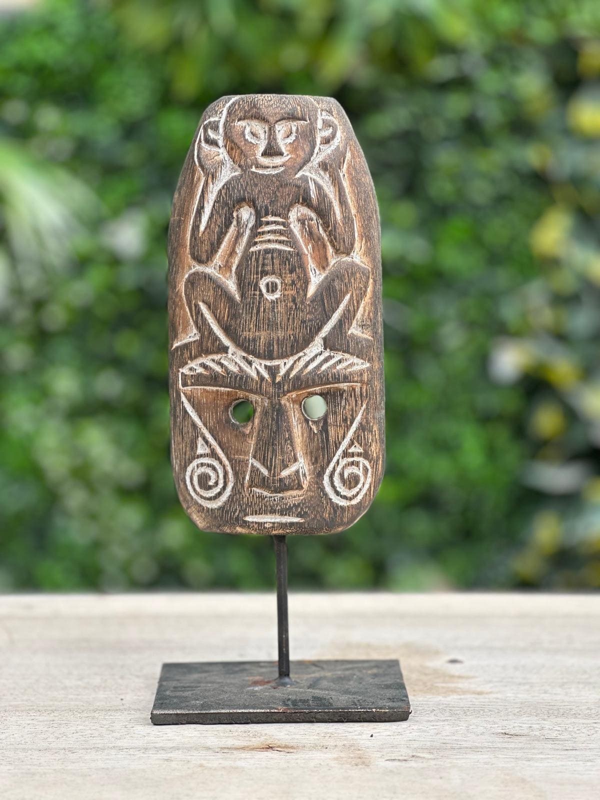 Apportez une touche d’élégance artisanale à votre intérieur avec cette statuette en bois sculpté de Bali. Représentant un visage avec un singe assis, cette décoration unique, faite à la main, est disponible en deux tailles. Idéale pour enrichir votre décoration avec une pièce exotique et sophistiquée, elle saura capter l’attention et ajouter une note authentique à votre espace.