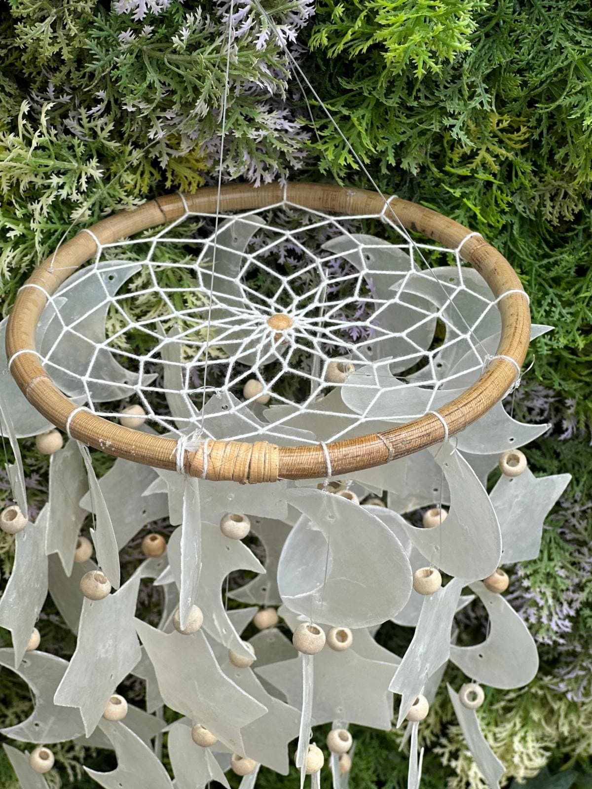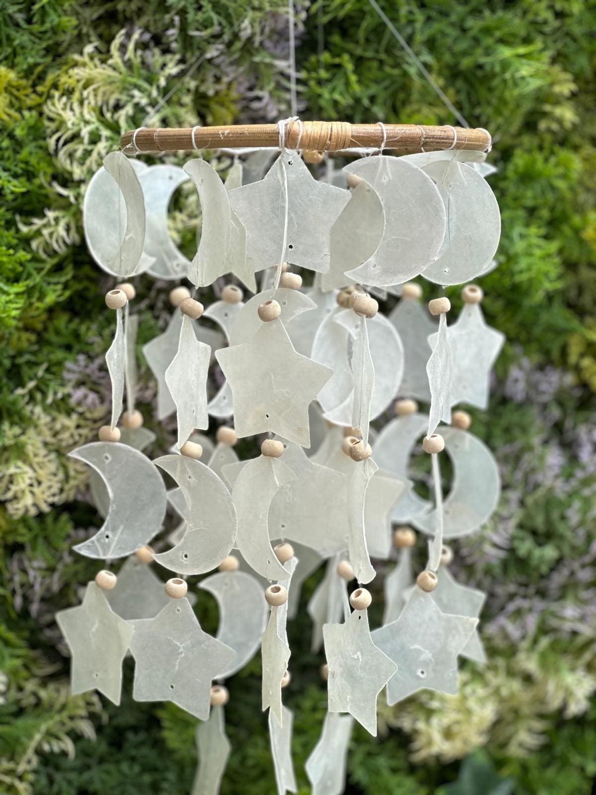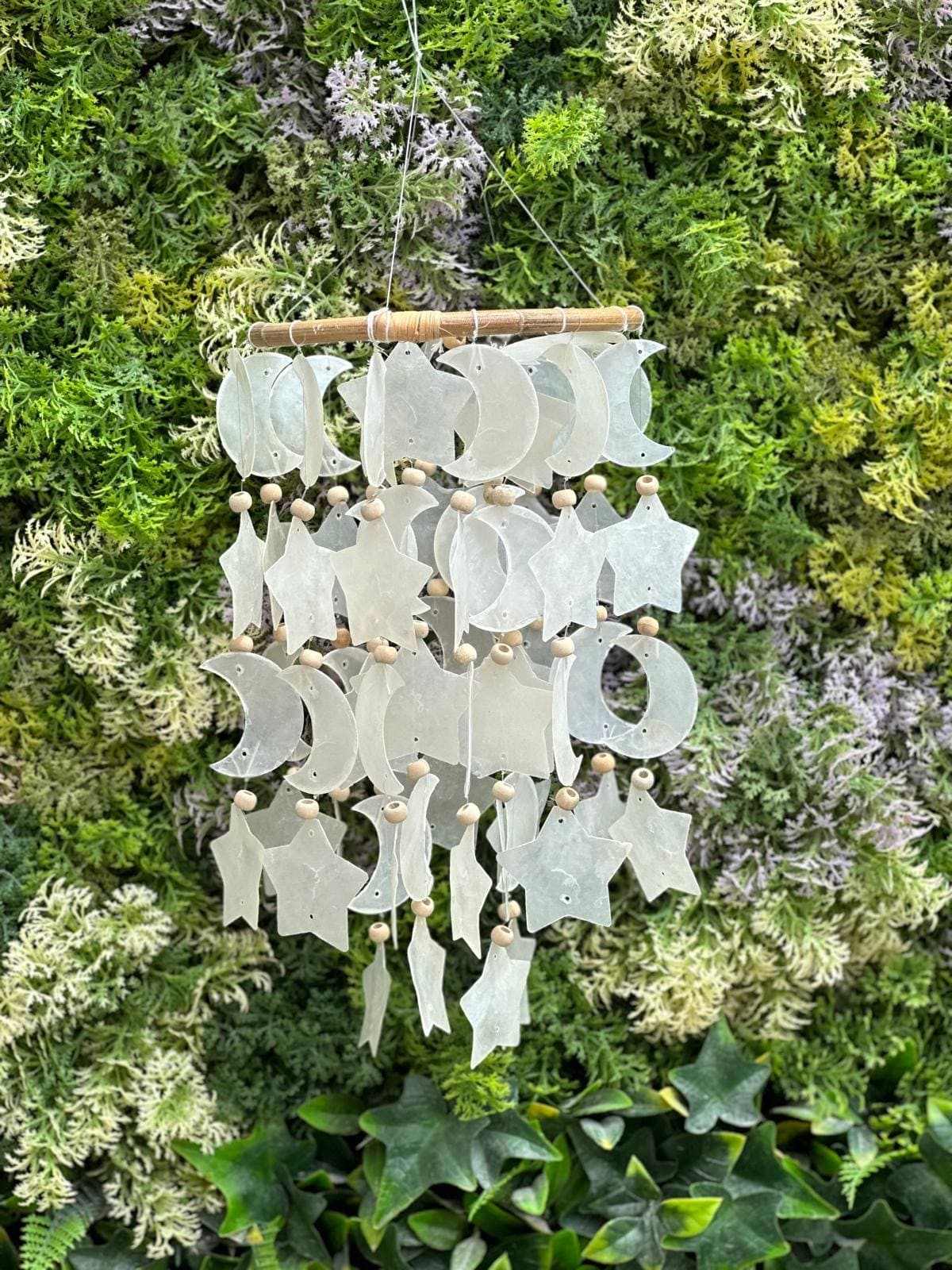 Apportez une touche céleste à votre intérieur avec notre suspension lunes et étoiles en nacre, faite à la main par des artisans balinais. Ornée de lunes et d’étoiles suspendues à un cercle avec des fils tressés en forme de fleur, cette suspension de Bali ajoute une élégance et une magie unique à votre décoration.