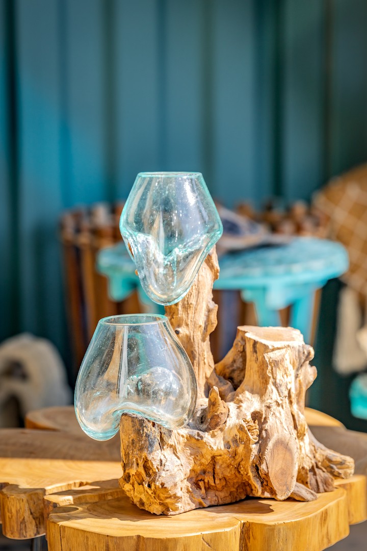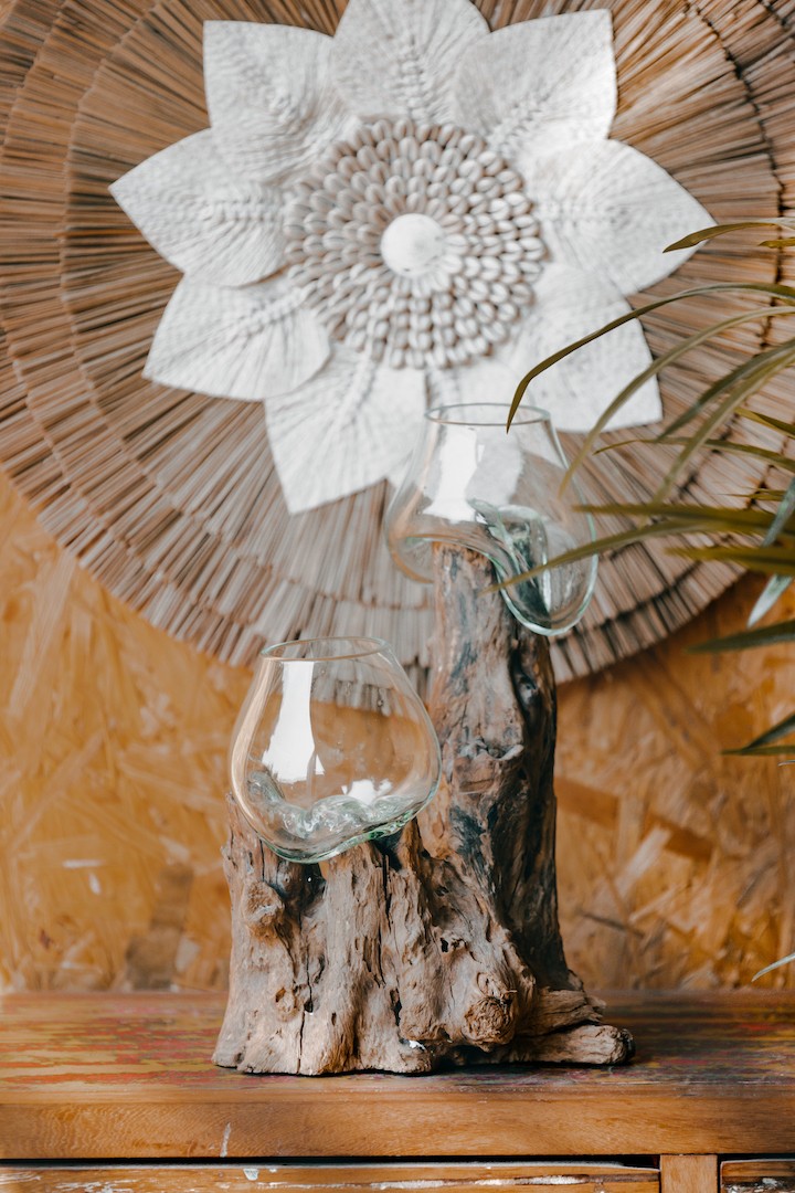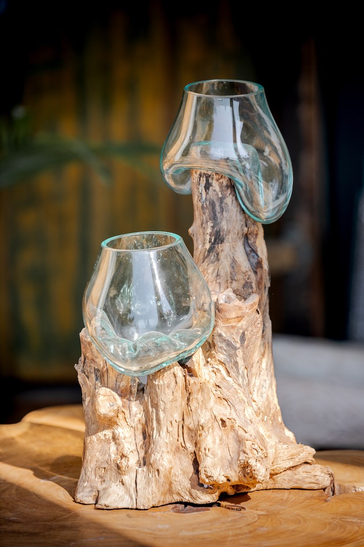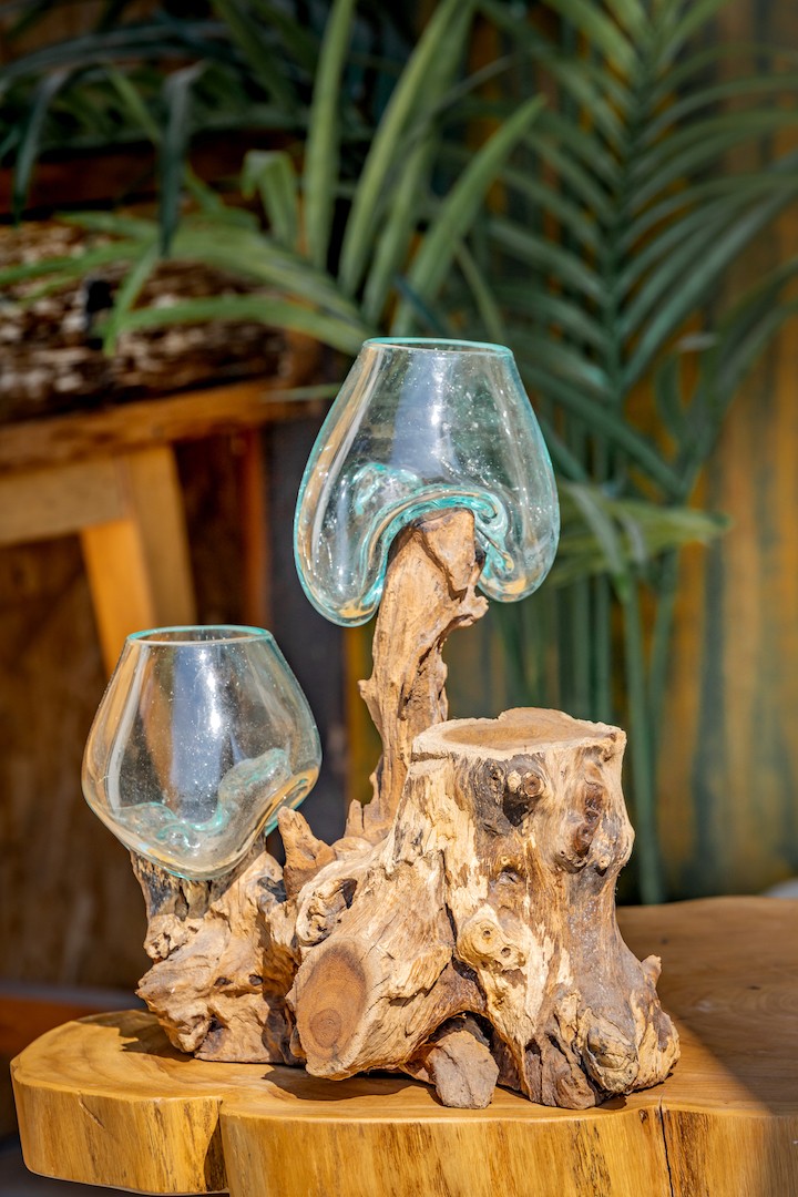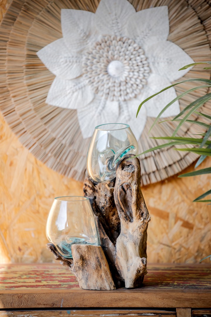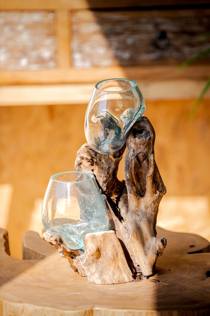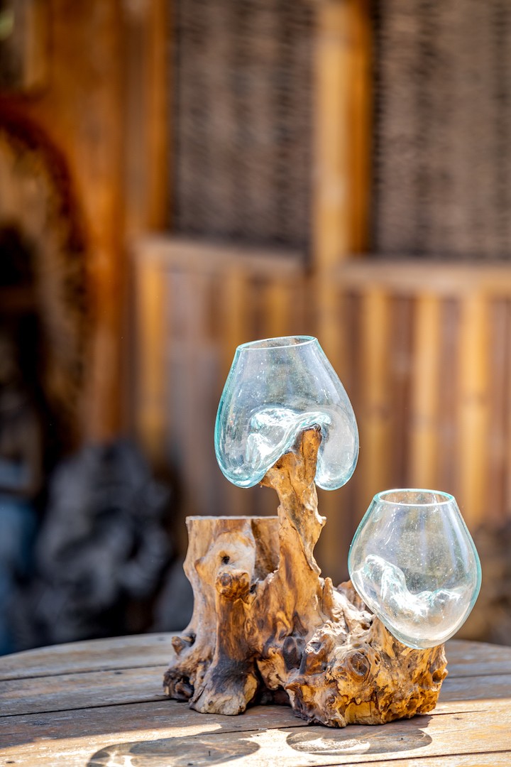 Le verre soufflé double sur une racine de teck est une pièce unique et magnifique, créée avec soin et expertise par des artisans balinais talentueux. Le processus de fabrication de ce verre est méticuleux et nécessite une grande habileté.